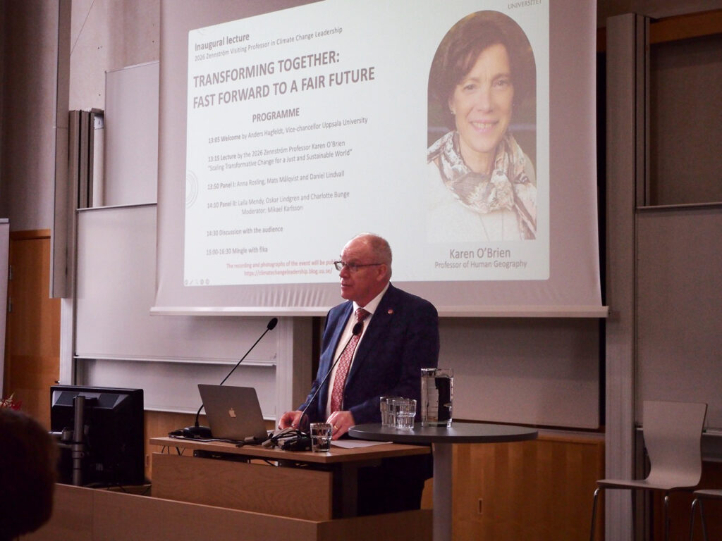Karen O’Brien, the new Zennström Visiting Professor in Climate Change Leadership, delivered her inaugural lecture at Geocentrum, Uppsala University, on 16 March 2026. O’Brien, co-founder of cCHANGE and Professor Emerita of human geography at University of Oslo, led the audience through an inspiring account of her personal and professional journey, showing how the two have informed one another and shaped her approach to climate transformations. She brought a hopeful vision on how to bridge theory and practice for change. Her lecture, titled Scaling Transformative Change for a Just and Sustainable World, was followed by two panel discussions, moderated by Associate Professor Mikael Karlsson. The panel discussions featured both senior and early‑career researchers from Uppsala University and opened up engaging conversations that we hope will continue during O’Brien’s visiting professorship.